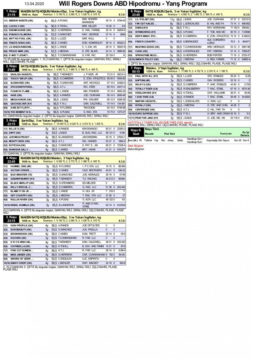 13 Nisan 2020 Will Rogers Downs’a ait yarış bülteni fotoğrafta olduğu gibidir. Fotoğrafı büyütüp detaylara göz atabilirsiniz.