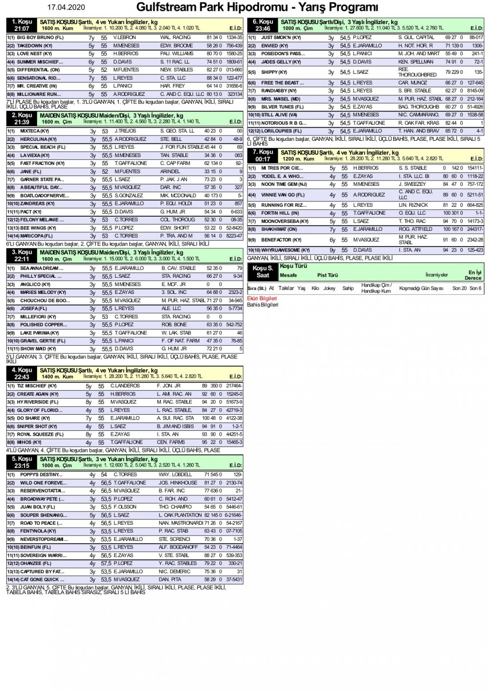 17 Nisan 2020’de TJK’nin bültenine dahil ettiği Gulfstream Park’ta 9 yarış yer alıyor. İlk yarış 21.07’de başlayacak, yarışlar 00:17’de tamamlanacak. Fotoğrafa tıklayarak detaylara ulaşabilirsiniz.