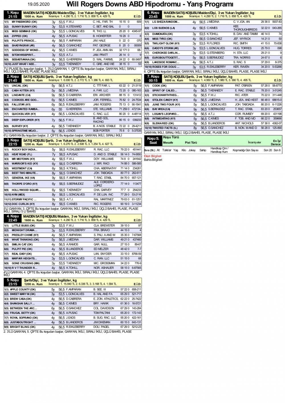 At yarışı heyecanı 19 Mayıs 2020’de Will Rogers Downs ABD‘de gerçekleştirilecek 7 koşu sürecek. At yarışı tahminleri ise burada olacak.