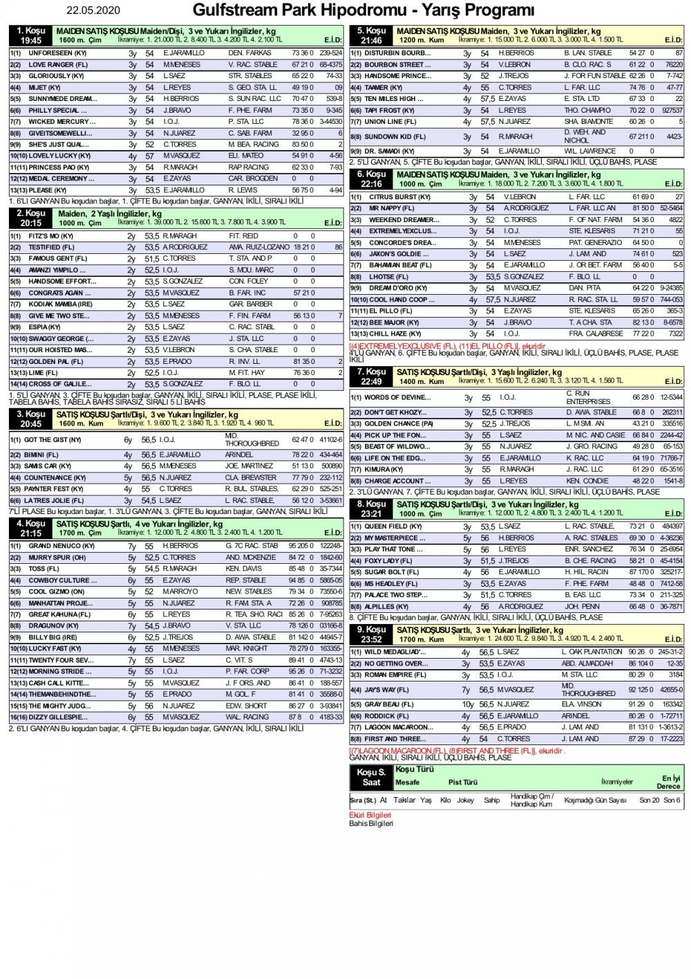At yarışı heyecanı 22 Mayıs 2020’de Gulfstream Park Hipodromu’nda gerçekleştirilecek 9 koşu ile sürecek. 22 Mayıs At yarışı tahminleri ise burada olacak.