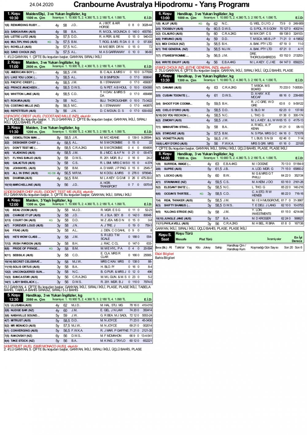 24 Nisan 2020’de Cranbourne Avustralya Hipodromu’nda gerçekleştirilecek ilk koşu saat 10.30; son koşu ise 14.00’de gerçekleştirilecek.