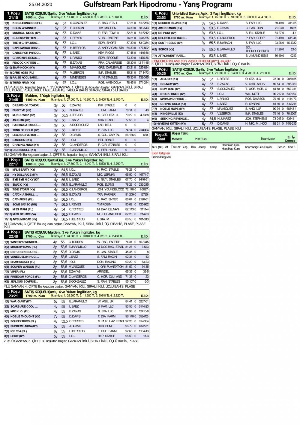 25 Nisan 2020 Cumartesi, Gulfstream Park‘ta yarışseverleri toplam 7 koşu bekliyor. Gulfstream Park‘taki İlk koşu 21.15′te; son koşu 00.25’te gerçekleştirilecek.  25 Nisan 2020 at yarışı bülteni ise şu şekilde;