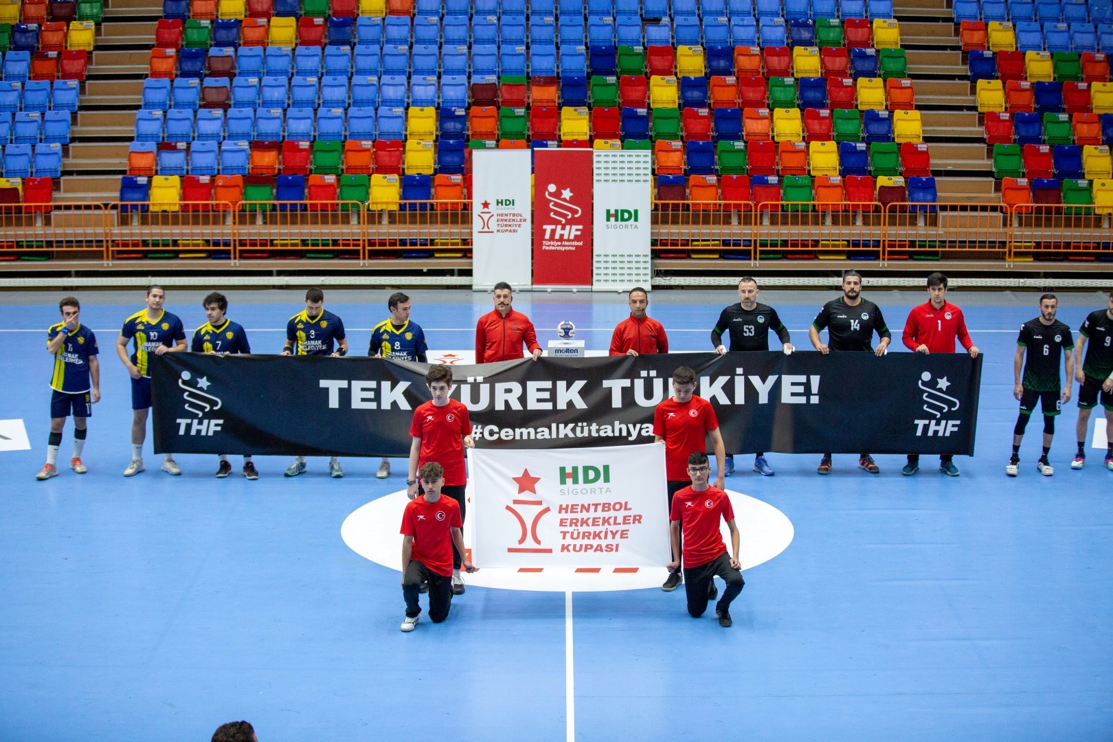 Karşılaşmalara oyuncular “Tek Yürek Türkiye #CemalKütahya” yazılı pankartla çıkarken, depremde hayatını kaybedenler için saygı duruşunda bulunuldu.